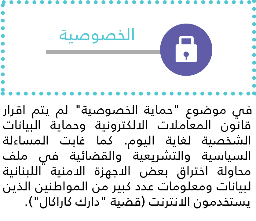 In terms of “Privacy Protection”, the electronic transactions and personal data protection law has not been adopted to date. Political, legislative and judicial accountability was also absent in the case of certain Lebanese security services attempting to hack data and information for a large number of citizens using the Internet (the “Dark Caracal” case)