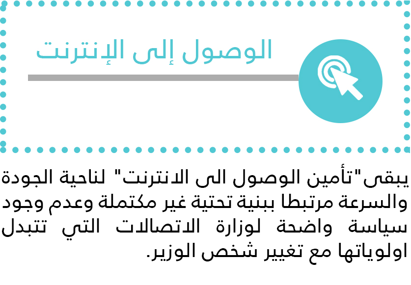 As for “Securing Access to Internet”, in terms of quality and speed, it remains associated with an incomplete infrastructure and the absence of a clear policy for the Ministry of Telecommunications whose priorities shift with the change of the Minister