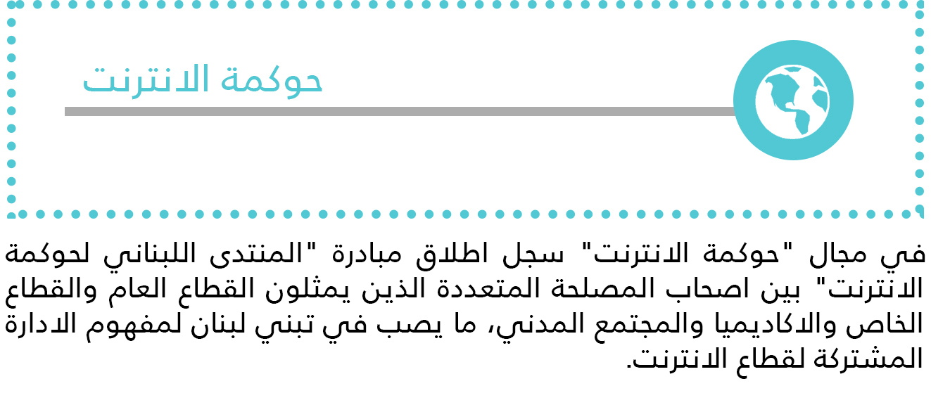 The launching of the “Lebanon Internet Governance Forum” a multistakeholder initiative including the public and private sectors, academia and the civil society, was recorded in the field of “Internet Governance”, which falls within Lebanon’s adoption of the concept of joint management of the Internet Sector