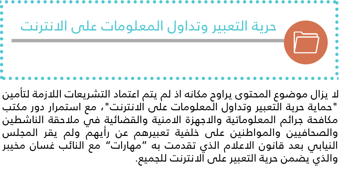 لم يسجل اي تقدم في حماية التعبير على الانترنت، اذ لم يطرأ اي تبدل على دور مكتب مكافحة الجرائم المعلوماتية والاجهزة الامنية والقضائية في استدعاء ناشطين وصحافيين وتوقيفهم على خلفية التعبير على الانترنت. كما لم يقر مشروع قانون الاعلام الذي يضمن حرية الانترنت كحق أساسي لكل مواطن.