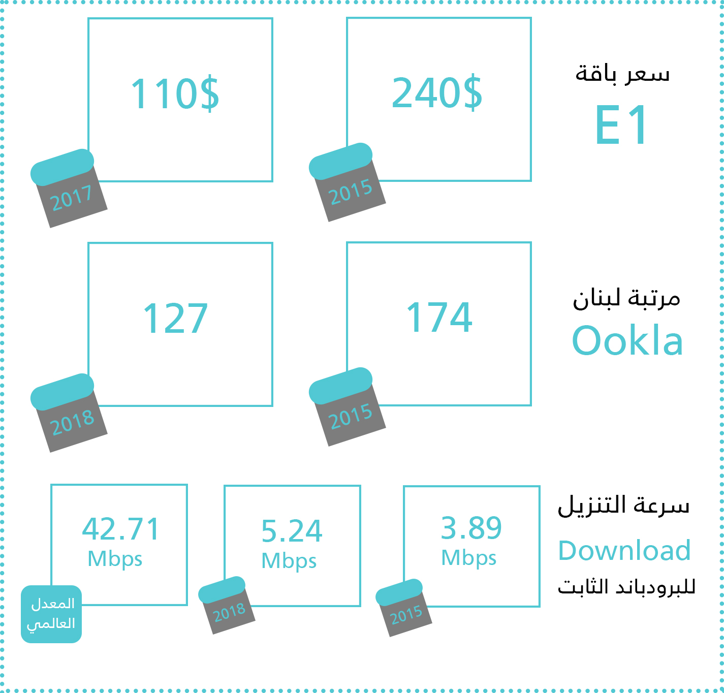 تؤكد وزارة الاتصالات وهيئة اوجيرو على تحسن خدمة الانترنت والزيادة في السرعات، ويشير مؤشر اختبار سرعة الانترنت العالمي التابع لـ OOKLA الى تقدم لبنان من المرتبة 174 الى 127 بسرعة تنزيل 5.24 ميغابيتس في الثانية مقابل 42.71 المعدل العالمي للبرودباند الثابت. ولكن لا يرقى هذا التحسن الى المستوى المطلوب لجعل لبنان مركزا للاقتصاد الرقمي.