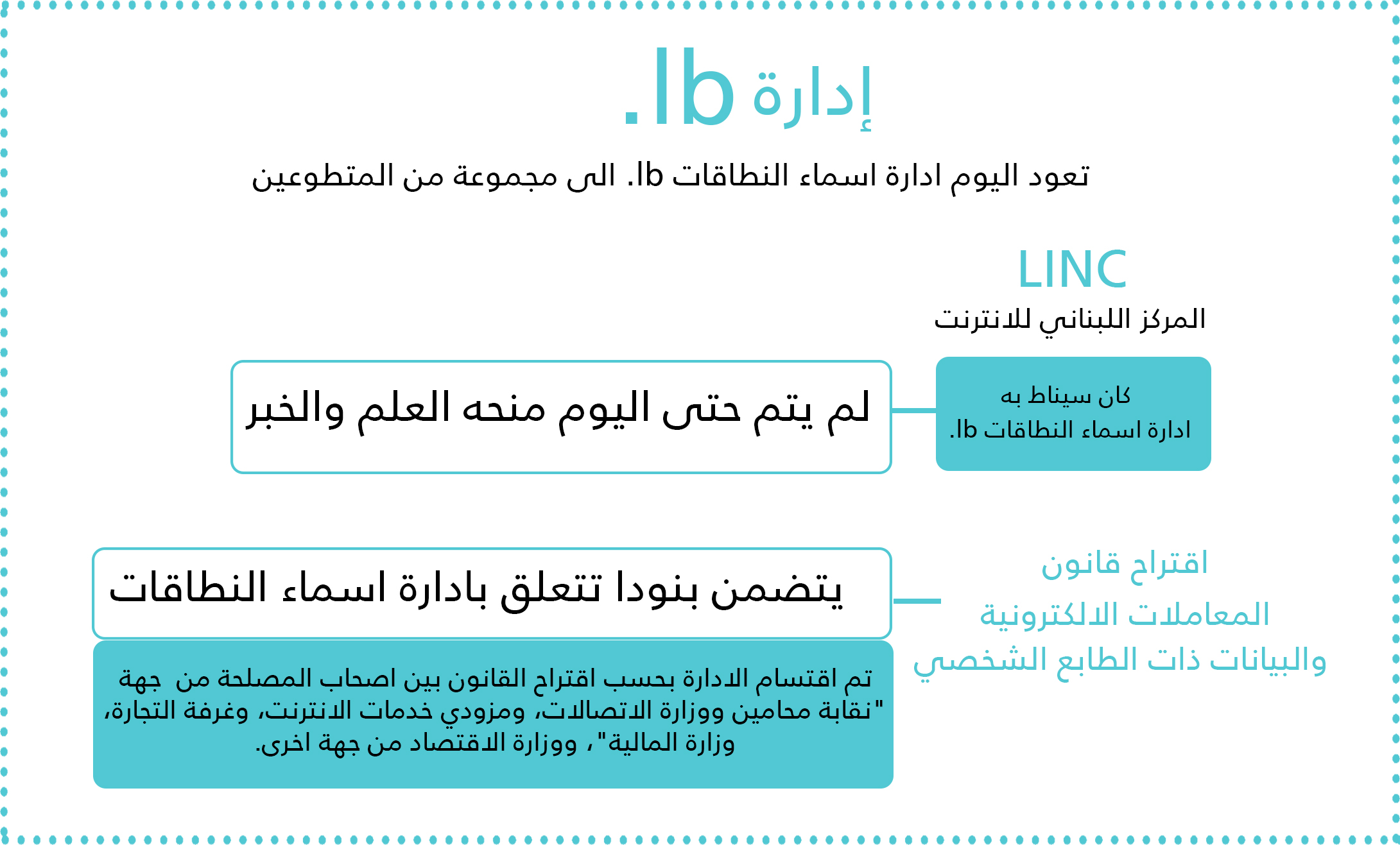 وتضمن اقتراح قانون المعاملات الالكترونية والبيانات ذات الطابع الشخصي بنسخته المعدلة بنودا تتعلق بادارة اسماء النطاقات .lb، اذ تم اقتسام الادارة بحسب اقتراح القانون بين اصحاب المصلحة من جهة "نقابة محامين ووزارة الاتصالات، ومزودي خدمات الانترنت، وغرفة التجارة، وزارة المالية"، ووزارة الاقتصاد من جهة اخرى.