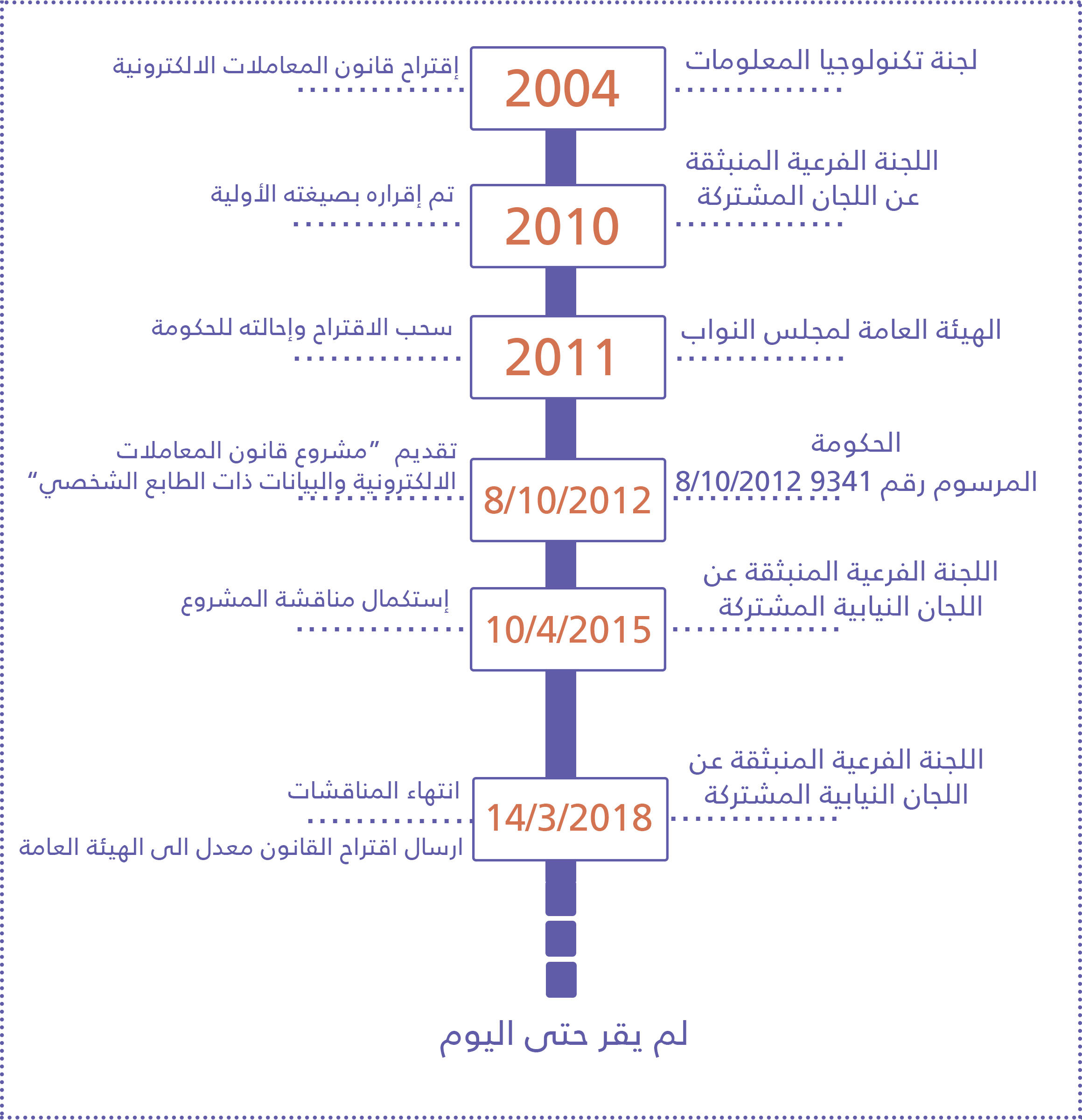 انتهت النقاشات في اللجنة الفرعية المنبثقة عن اللجان النيابية المشتركة الموكلة درس اقتراح قانون المعاملات الالكترونية والبيانات ذات الطابع الشخصي في 14 اذار 2018، وارسل مشروع قانون المعاملات الالكترونية معدلا الى الهيئة العامة من اجل اقراره. يتضمن القانون تعديلات اساسية عن النسخة الاولى التي ارسلت الى مجلس النواب في العام 2012.
