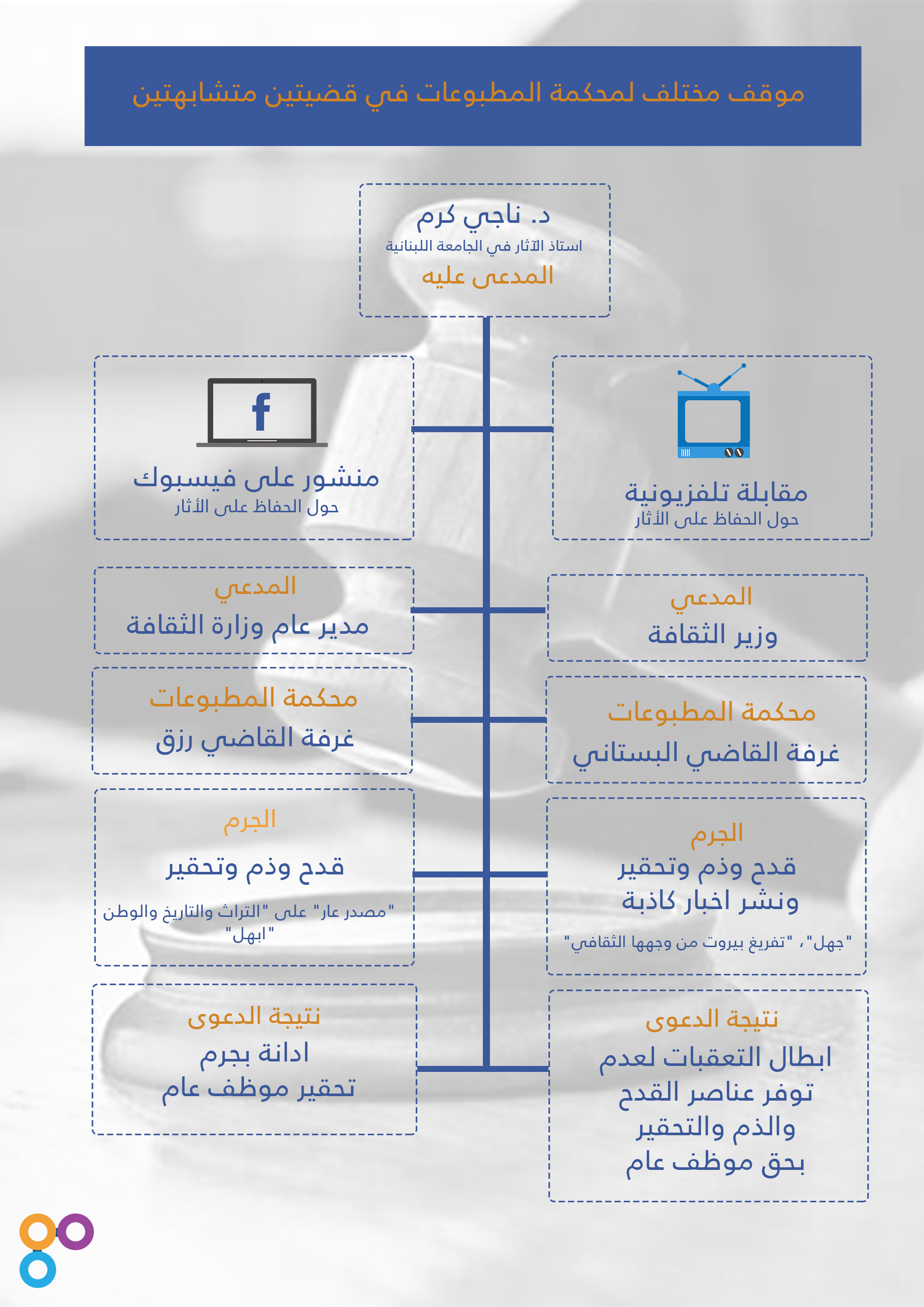 بتاريخ 24/5/2017 انهت المحكمة برئاسة القاضي روكس رزق النظر في قضية الدعوى من مدير عام الثقافة بخصوص منشورات د. كرم على فيسبوك واصدرت حكما قضى بتجريم المدعى عليه د. ناجي كرم بجرم تحقير موظف عام بموجب المادة 22 من جرائم النشر المنصوص عنها في قانون المطبوعات